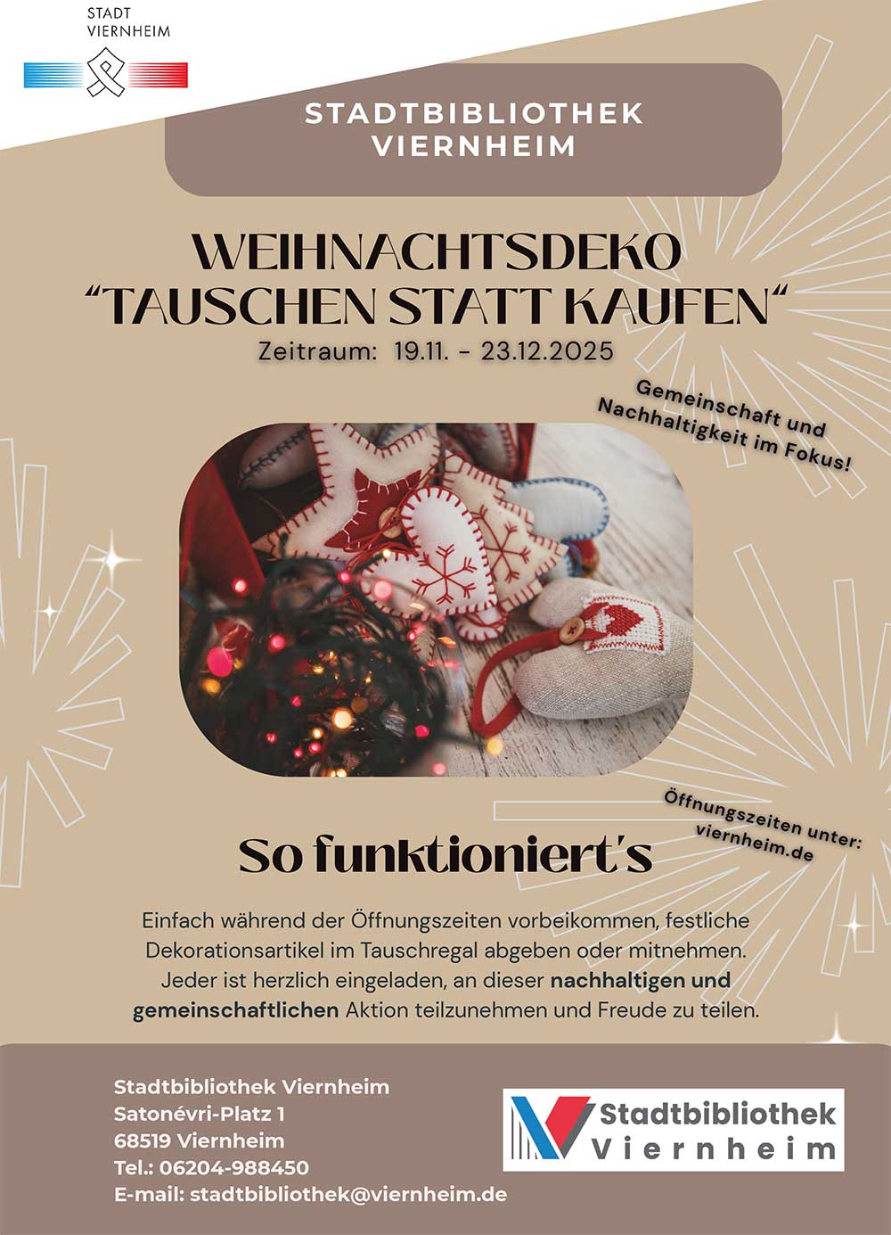 Viernheim (Stadt Viernheim) – Unter dem Motto „Weihnachtsdeko tauschen statt kaufen“ setzt die Stadtbibliothek in der Vorweihnachtszeit ein Zeichen für Nachhaltigkeit und Kreativität