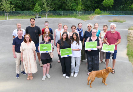 Die besten Teams wurden am vergangenen Montag (23. Juni) im Rahmen einer feierlichen Siegerehrung im Familiensportpark West am Jugendtreff „Treff im Bikepark“ ausgezeichnet. Bürgermeister Baaß ehrte gemeinsam mit Myriam Buddensiek, Klimaschutzmanagerin und Koordinatorin der Aktion im Brundtlandbüro und Sandra Schäfer-Schwarz vom Verein KOMPASS Umwelt- und Energieberatung e. V. als Unterstützer die Siegerteams mit den meisten Fahrradkilometern sowie die besten drei Klassen pro weiterführende Schule. „Neu in diesem Jahr ist, dass die Schulen sich das Siegertreppchen mit den besten drei öffentlichen Teams teilen. So erhalten auch kleinere Teams eine Chance auf die ersten drei Plätze – ganz im Sinne des Teamgeistes,“ erklärt Myriam Buddensiek. Auch Lars Prechtl von der städtischen Jugendförderung war als Vertreter der Bikepark-Initiative vor Ort und stand für Fragen zum Pumptrack bereit.
