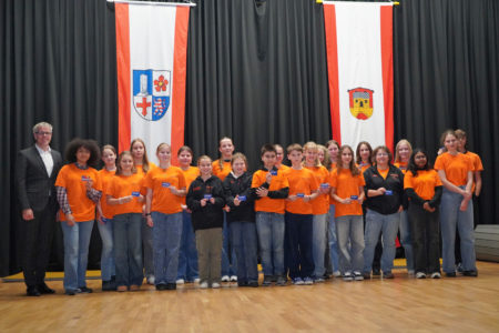 Goethe-Gymnasium Bensheim: Landrat Christian Engelhardt (links) mit den ehrenamtlichen Schulsanitäterinnen und -sanitätern vom Goethe-Gymnasium Bensheim, denen der Landrat in Einhausen die Ehrenamts-Card überreichte.