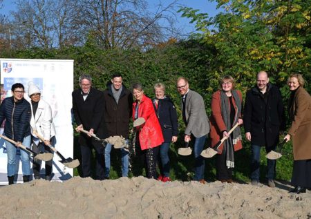 Kreis Bergstraße (kb)-Wegen steigender Schülerzahlen und des damit verbundenen Bedarfs an zusätzlichen Klassenräumen wird die Grundschule in den Kappesgärten in Bensheim erweitert. Der symbolische Spatenstich für den Erweiterungsbau wurde mit Landrat Christian Engelhardt, Schulleiterin Helga Krumbein, dem Architekturbüro werk.um, den Experten für nachhaltigen Holzbau von der Firma Mobispace GmbH und der Schulgemeinde nun offiziell gefeiert.