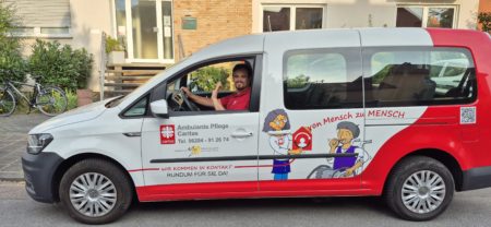 Viernheim (Caritas) – Einsteigen und wohlfühlen: Kazakova Roman, Fahrer des ambulanten Pflegedienstes Viernheim auf dem Weg zu den Besucherinnen und Besuchern der Seniorengruppe „Vergissmeinnicht“ in Viernheim und Heppenheim.