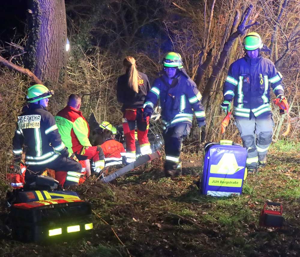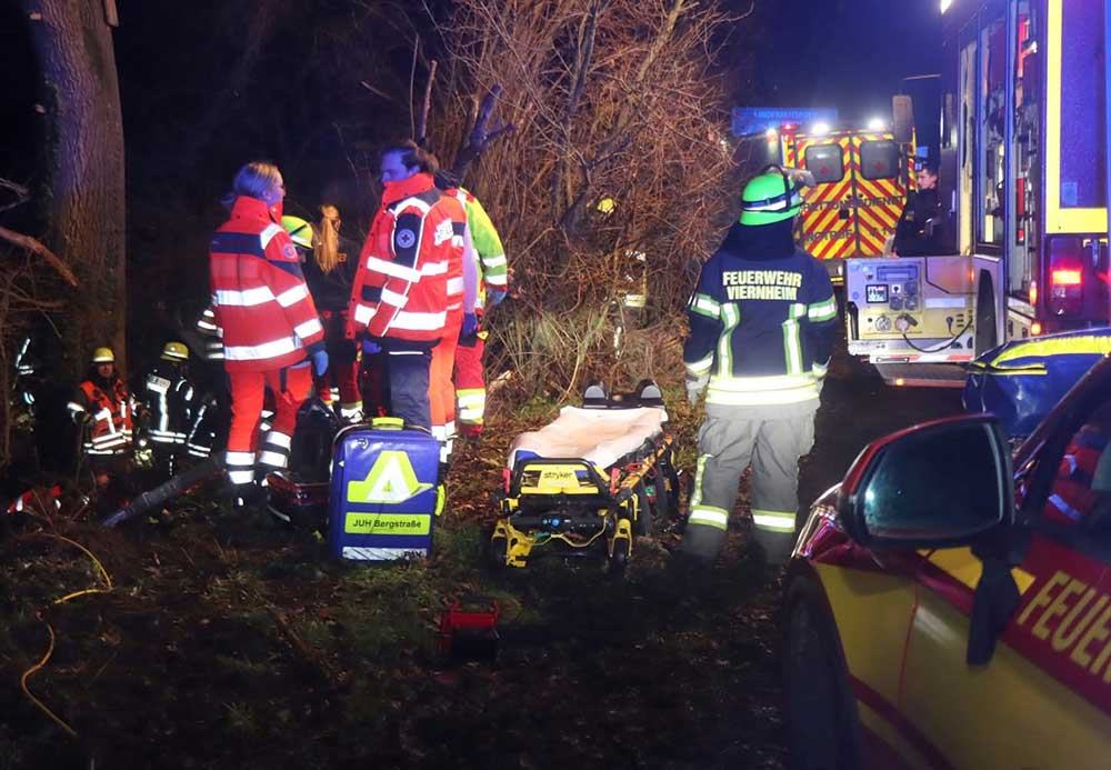 Im Fahrzeug befanden sich zu diesem Zeitpunkt vier junge Männer aus Viernheim im Alter zwischen 17 bis 23 Jahren. Zwei der Fahrzeuginsassen wurden infolge des Unfalls im Fahrzeug eingeklemmt und mussten durch Kräfte der Feuerwehr Viernheim gerettet werden. Eine Person konnte sich schwer verletzt selbst aus dem Fahrzeug befreien und eine weitere Person aus dem Fahrzeug ziehen.