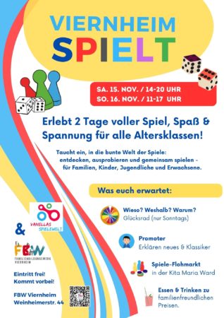 Viernheim (FBW) – Spielen verbindet! Unter diesem Motto laden Vanellas Spielewelt und das Familienbildungswerk Viernheim herzlich zu einem bunten Wochenende rund ums Spielen ein.