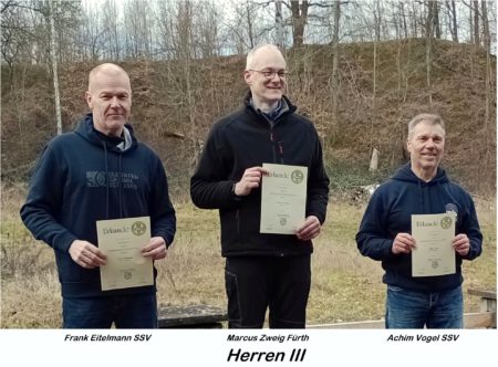 Erfolgreich verlief der Wettkampftag auch für die Herren III. In dieser Altersklasse sicherte sich Andreas Treiber vom SSV Viernheim den Titel des Bezirksmeisters. Die Plätze zwei und drei gingen an Marcus Zweig und Thomas Katzenmeyer, beide aus Fürth. In der zugehörigen Mannschaftswertung erkämpften sich die Viernheimer Schützen die Silbermedaille.