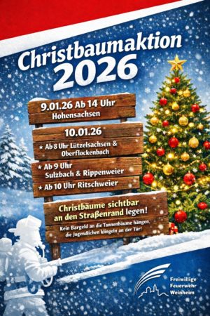 Und wenn es doch mal brennen sollte, Ihre Freiwillige Feuerwehr ist auch dieses Jahr wieder rund um die Uhr an 365 Tagen für Sie da. Die Notrufnummer für Feuerwehr und Rettungsdienst – 112. Wer seinen Weihnachtsbaum noch entsorgen muss, kann ihn als Grünschnitt bei der AVR Rhein – Neckar anmelden. Alternativ kann man den Baum auch in sein Auto laden und auf den Kompostplatz im Hammerweg 69 in Weinheim, oder zur Sammelannahmestelle der AVR in Hirschberg (Lobdengaustraße 21) fahren. Aber auch die Weinheimer Jugendfeuerwehr sammelt am kommenden Wochenende in den Ortsteilen die Bäume ein.