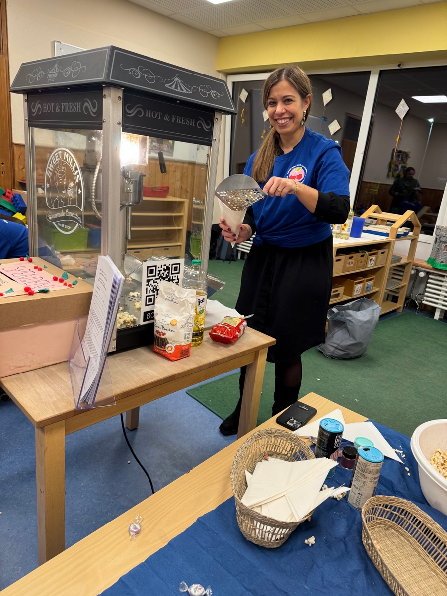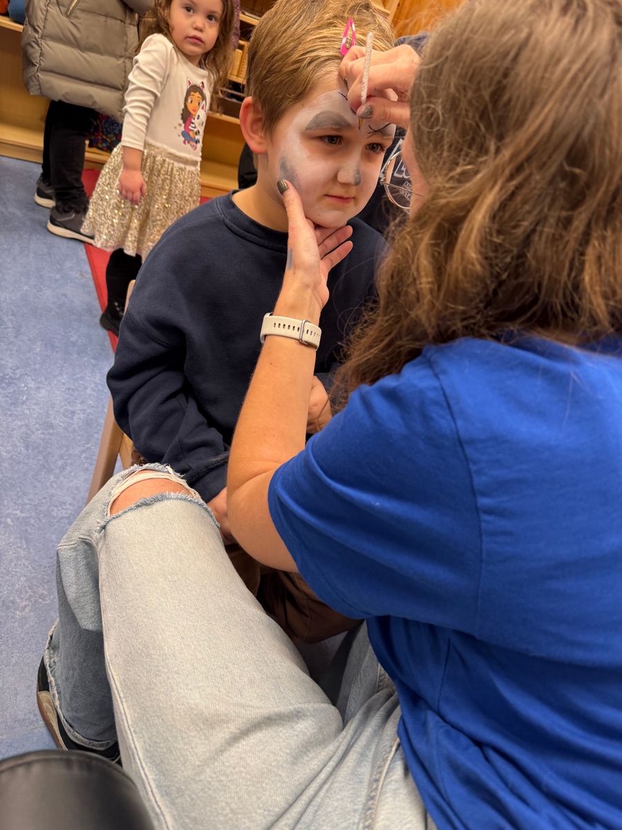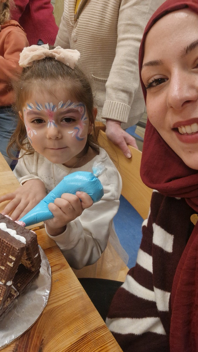Der Förderverein des Familienzentrums bereicherte die Weihnachtswerkstatt mit kunstvollem Kinderschminken und einem Popcornstand. Letzterer bereicherte gemeinsam mit der nebenan stattfindenden Weihnachtsbäckerei, in der Waffeln gebacken wurden, neben dem Geschmacksinn auch den Geruchssinn mit weihnachtlichen Impressionen.