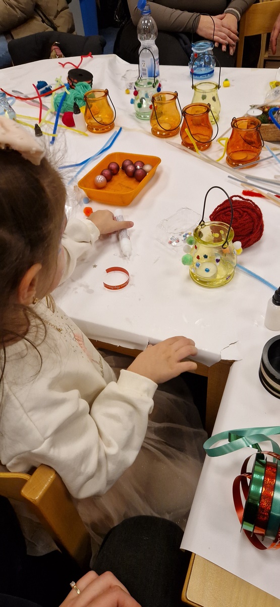 Das Angebot an Bastelaktivitäten war überwältigend und wurde von den Besuchern dankbar angenommen. Teilweise bildeten sich lange Warteschlangen. Der Kreativität waren dabei keine Grenzen gesetzt. So wurden in einem Zimmer Weihnachtsgeschenke aus Lebensmitteln kreiert, im nächsten konnten Weihnachtsbücher gefaltet werden, eine Tür weiter wurden Kerzen kunstvoll verziert und in drei weiteren Zimmern wurden Teelichtgläser weihnachtlich verziert, Weihnachtskarten gebastelt bzw. Weihnachtskugeln bemalt. Wen es lieber an die frische Luft zog, der konnte im weihnachtlich beleuchteten Außengelände bei Lagerfeuer Weihnachtssterne aus Holz gestalten.