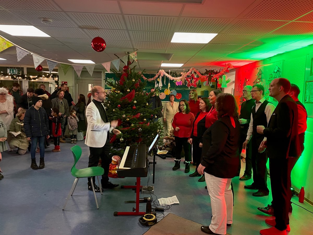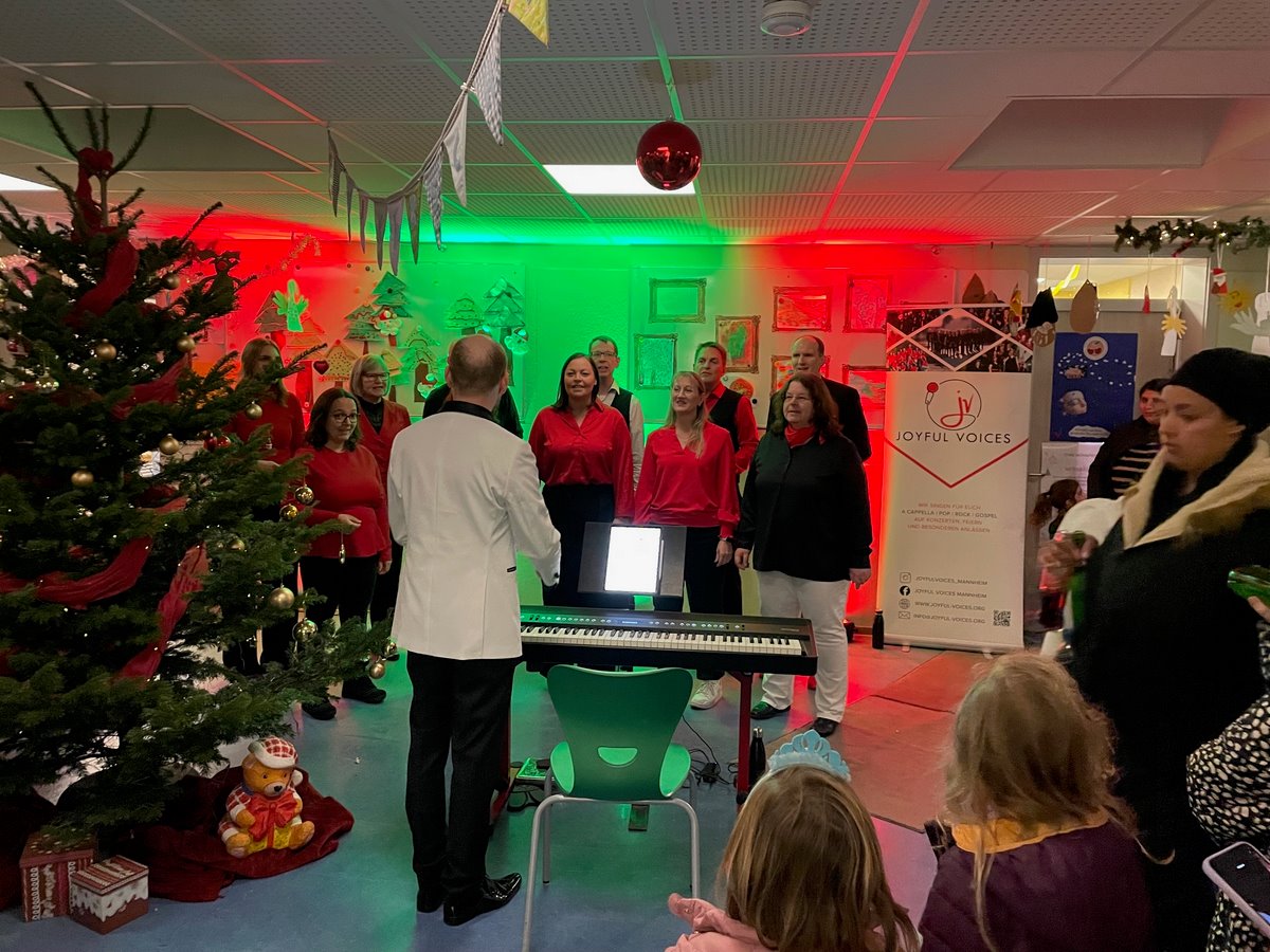 Großer Aufwand wurde vom Mitarbeiterteam und Eltern aber auch in der Diele des Familienzentrums betrieben. Diese wurde vor Beginn der Weihnachtswerkstatt von den Kindergarderoben komplett leergeräumt, um dem bekannten Mannheimer Gospelchor „Joyful Voices“, der für ein Gastspiel engagiert werden konnte, eine Bühne zu bieten. Unmittelbar nach der ersten Theatervorstellung verbreitete der Chor in der sich rasch füllenden Diele mit bekannten Songs, wie „Going to Bethlehem“, „Where are you Christmas“, „Gloria“, „A Wonderful Christmastime“ eine zauberhafte Weihnachtsatmosphäre, die auch die Gäste erreichte, die sich aufgrund der Bastelaktivitäten in den benachbarten Räumlichkeiten, zunächst nicht in der Diele einfinden konnten.